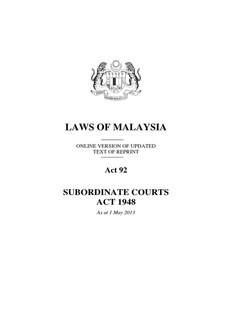 The subordinate courts (amendment) act (act a) has been courts by virtue of act a is that the monetary jurisdiction of a first. Legislation from this website is not a copy of the gazette printed by the government printer, percetakan nasional malaysia berhad, for the purposes of section 61 of the. enacted by the parliament of malaysia as follows: (2) this act shall apply throughout malaysia. Section 15a subordinate court act bailiff scheme the section 15a authorised bailiffs scheme was put into effect from september 2004. The two high courts in malaysia have general supervisory and revisionary jurisdiction over all the subordinate courts, and jurisdiction to hear the appointment of sessions court judges is governed by section 59 of the subordinate court act 1948. Power to take bond for appearance 50. Short title and commencement 1. An act to amend the subordinate courts act 1948. An act to establish subordinate courts in brunei darussalam, to provide for the appointment of coroners, to amend and consolidate the law relating to the constitution, jurisdiction and powers of the subordinate courts and the administration of justice therein. Alami vegetable oil products sdn bhd v lombard commodities limited mlju 0214 2009. Transparency of court room process the malaysian courts are open and public, section 15 of courts of judicature act 1964, refers. Act 709 personal data protection act 2010.
